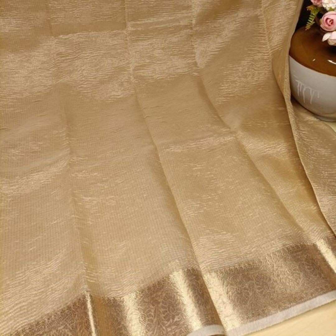Cream Gold Semi Crush Tissue Silk Saree from
