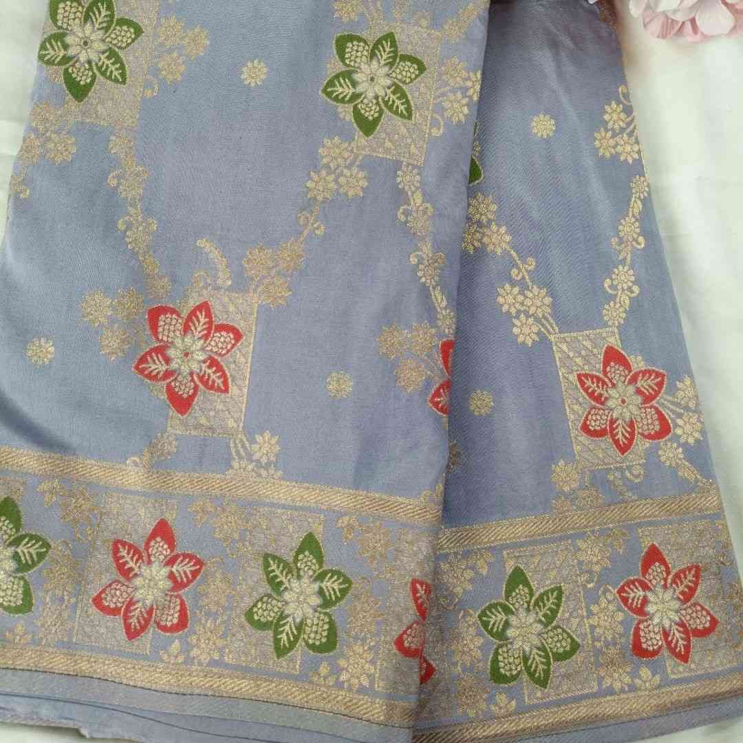 GREYISH BLUE FLORAL JAAL MEENA BANARASI VISCOSE SAREE