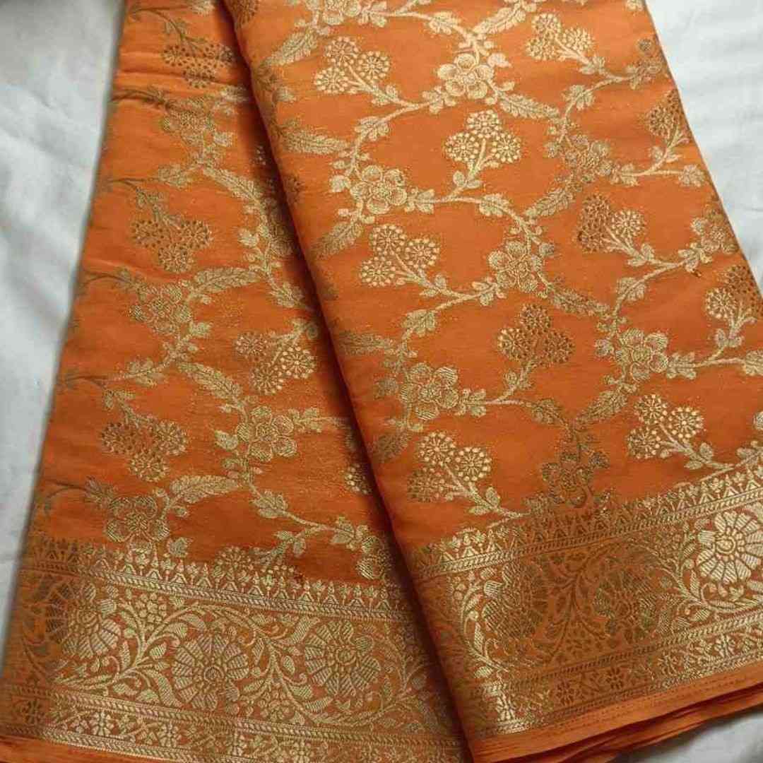 ORANGE TRIFLORAL JAAL BANARASI KHADDI GEORGETTE SAREE
