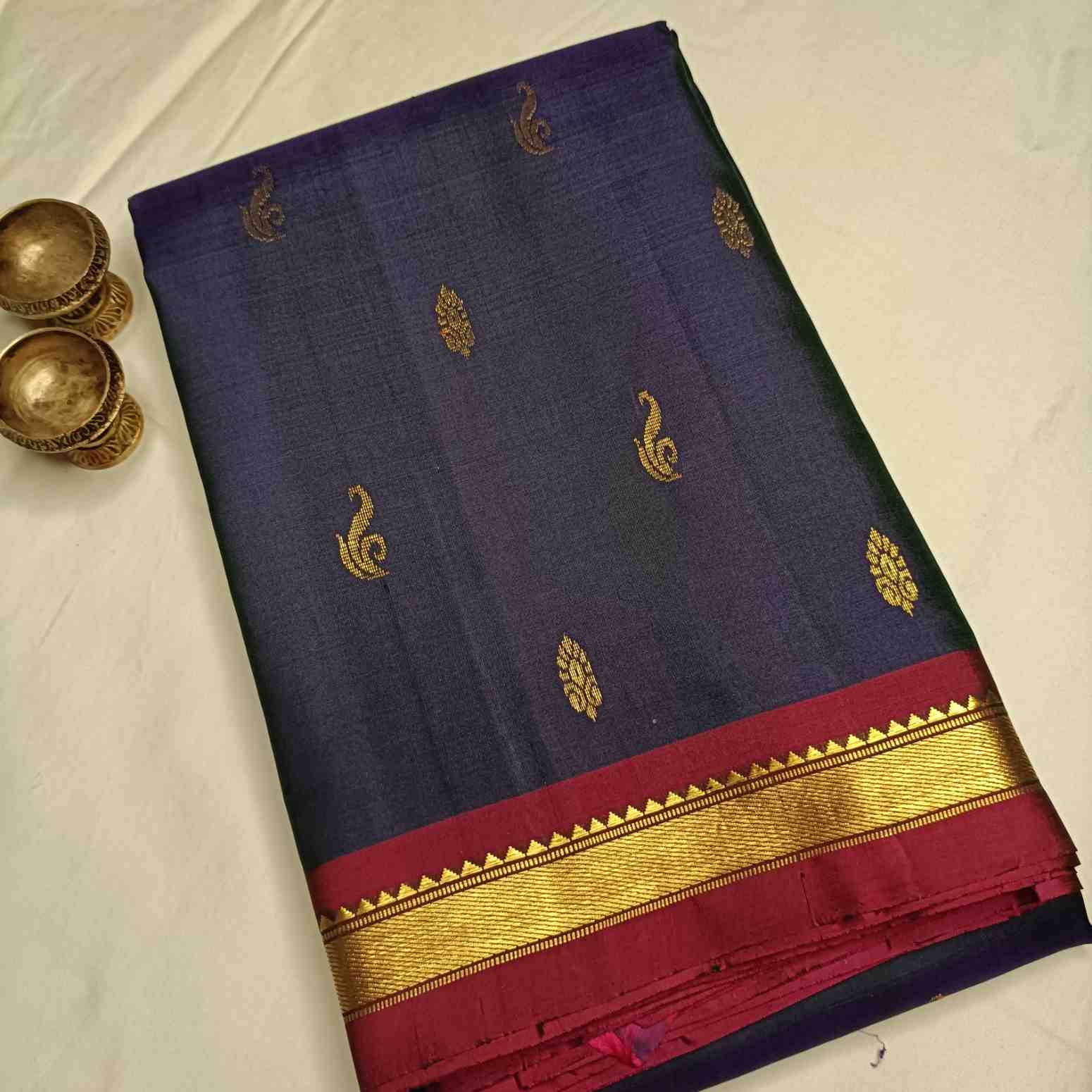 • Color: Navy Blue (Aazhi Neelam) with paakku & arakku / maroon tonal highlights